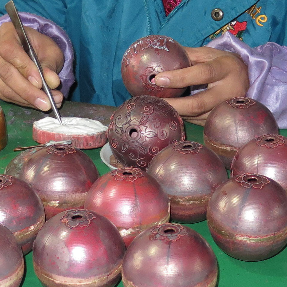 - Highly trained artisans take copper wires, in bundles of 20, and form and shape the design on the ornament. After the wires are shaped, they are placed onto the copper ball and soldered.