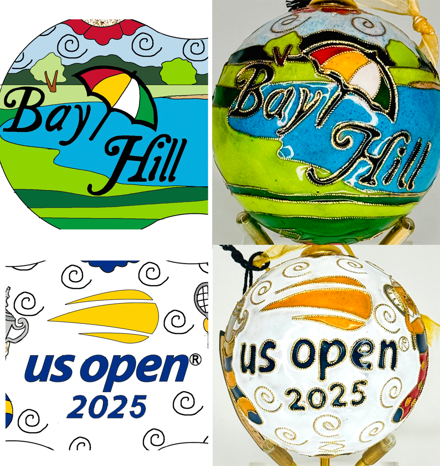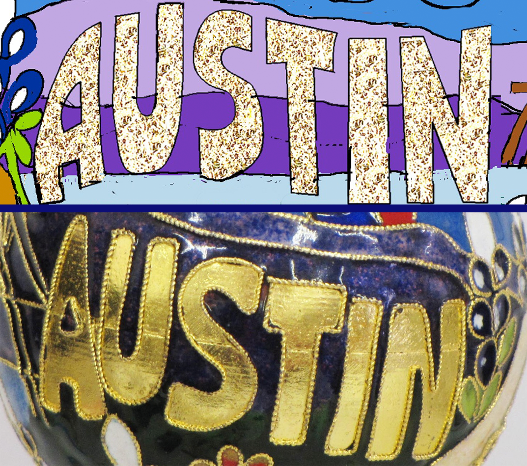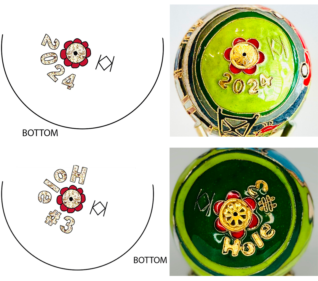 All black lines shown in the mockup, including the black swirls, will be gold-plated wiring in the final product. In the cloisonne process, the metal wiring creates ‘cloisons’ that are then filled with the enamel powder paint. A thicker black line indicates an area of the design that will have black paint outlined with gold-plated wiring.